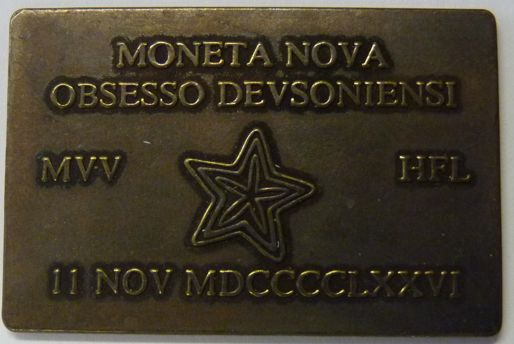 Bronze plaquette Italy 1976. Moneta Nova Obsesso Devsoniensi/MVV/HFL/11 NOV MDCCCCLXXVI. Ø 30,2×45,3 mm