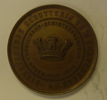 Bronzen prijspenning van de Officieren Schutterij, Den Haag 1874. Ø 32 mm