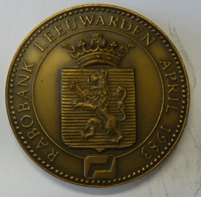 Bronzen penning Rabobank Leeuwarden April 1983. Vz.: Wapen van Leeuwarden met omschrift. Kz.: De Oude Munt te Leeuwarden. Kon. Begeer te Zeist. Ø 40 mm