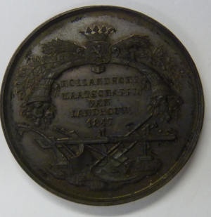 Bronzen prijsmedaille van de Hollandsche Maatschappij van Landbouw 1847. 3e prijs Tafelperen, Gouda 1882. Vz.: Twee hoornen des overvloeds, waaronder landbouwwerktuigen. Kz.: Inschriptie onder lauwerkrans. Model: J.P. Schouberg. Ø 39 mm
